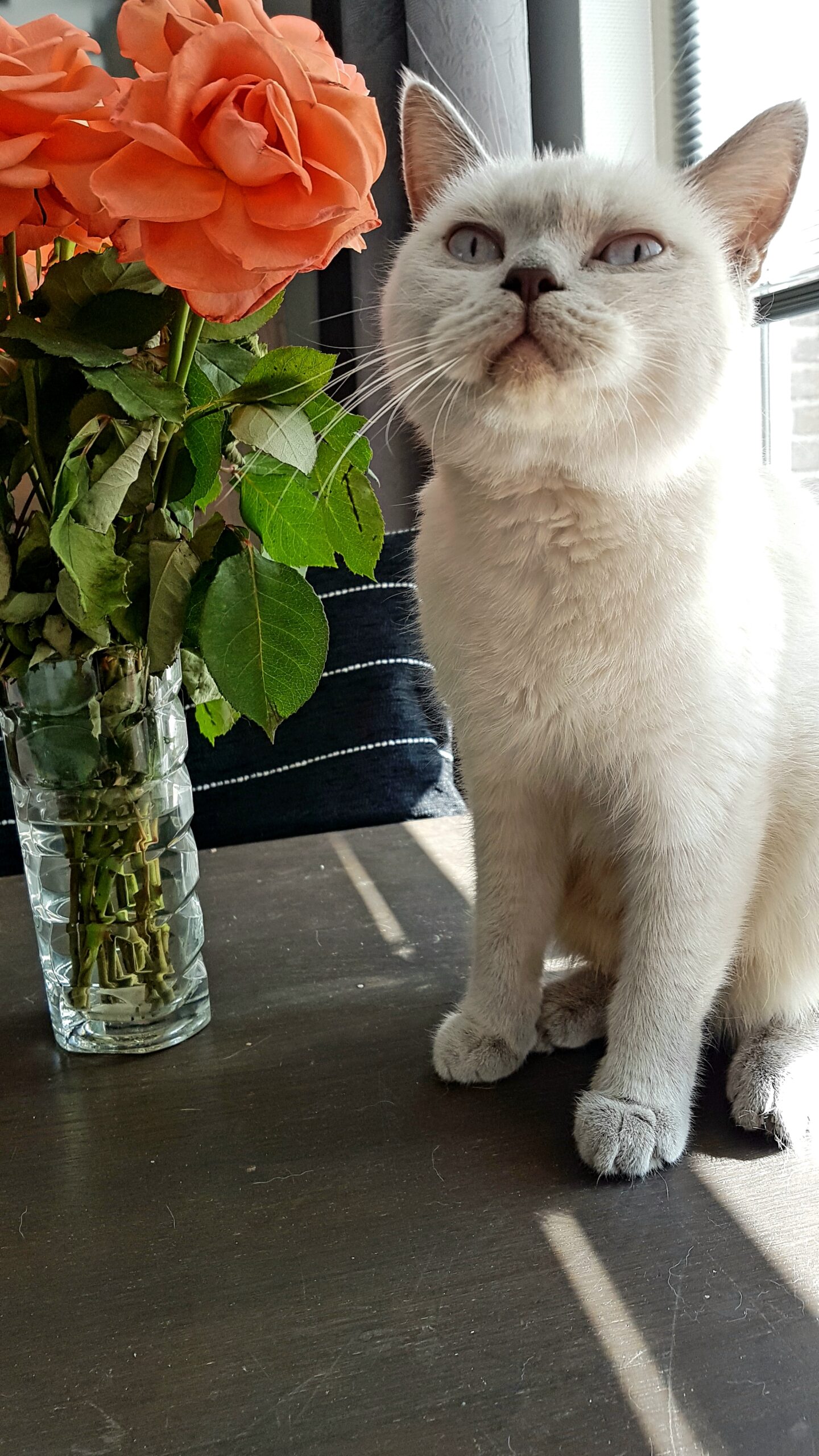 Durf haar in de ogen te kijken en ze zal je laten weten wat ze voor je voelt. Pixilette is de koningin van ons huis. Zij is de beslisser, de eerste die je zal begroeten als je haar territorium betreedt en alles en iedereen die binnenkomt moet eerst heel zorgvuldig worden besnuffeld. Als je nagels schoon zijn en je door de veiligheidscontrole komt, mag je jezelf als de gelukkige beschouwen en ben je vrij om haar hemelsblauwe ogen en sneeuwwitte lichaam te bewonderen. Als je echt geluk hebt, kun je zelfs door haar dichte vacht aaien. Dit zal je zeker herinneren aan je knuffel toen je een kind was. Wees voorzichtig, het aaien van deze poes kan verslavend worden! Ze zal ofwel van je houden of je haten, dus afhankelijk van haar humeur, maak je geen zorgen, ze toont haar agressiviteit door je te negeren en haar de rug toe te keren (ze zal in een tijger veranderen als je haar onwetendheid niet accepteert) of ze zal de meest liefste poes die je ooit in je hele leven hebt gezien die haar genegenheid toont door je handen te likken. Omdat ze een binnenkat is, hangt ze graag met haar nagels aan de deur en gluurt ze in de tuin, daarom noemen we haar soms spidercat. Ze houdt van routines en haat het om gestoord te worden tijdens haar dutjes, alleen als je over haar buik aait, dan zal ze je helemaal aanbidden. Verder is ze om een zeer onbekende reden verslaafd aan droogvoer. Zou het misschien zijn omdat ze niet graag haar tanden poetst? Ze probeert soms naar buiten te ontsnappen om deze wonderbaarlijke grote wereld te verkennen, met vliegende vogels en kleine muizen, haar jacht- en 3 meter-springvaardigheden te oefenen, maar sinds we haar op het dak van de buren hebben gevonden, staat ze onder huisarrest. Uiteindelijk is ze heel loyaal aan haar huishouden en vriendelijk tegen bezoekers, maar blijft ze een bekwaam roofdier.