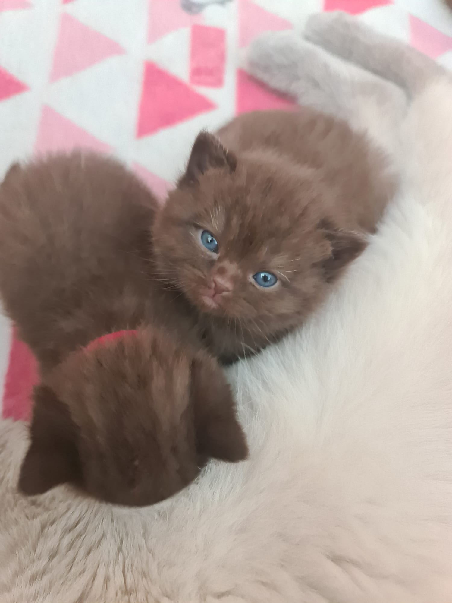 Onze Rosie is de dochter van Pixilette en is een ware schatje. Haar ogen zijn als 2 parels en kijken naar je als je met haar praat, nieuwsgierig naar wat er gaat gebeuren. Ze is een zeer proactieve poes die altijd als eerste in actie komt. Ze neemt het voorbeeld van haar moeder, wat haar moeder doet is prima om te doen. Ze heeft veel vertrouwen in mama’s beslissing en is vooral een echte mama-meid. Ze houdt van kusjes en niet zozeer om opgetild te worden. Als het enige meisje in de babygroep was ze de kleinste en meest elegantste. Zij is de roze van ons Cattery en we hebben besloten om Rosita aan te houden. Ze drinkt al 6 maanden moedermelk van haar moeder en nu is ze een sterke mooie dame. Onze lieve Rosita!