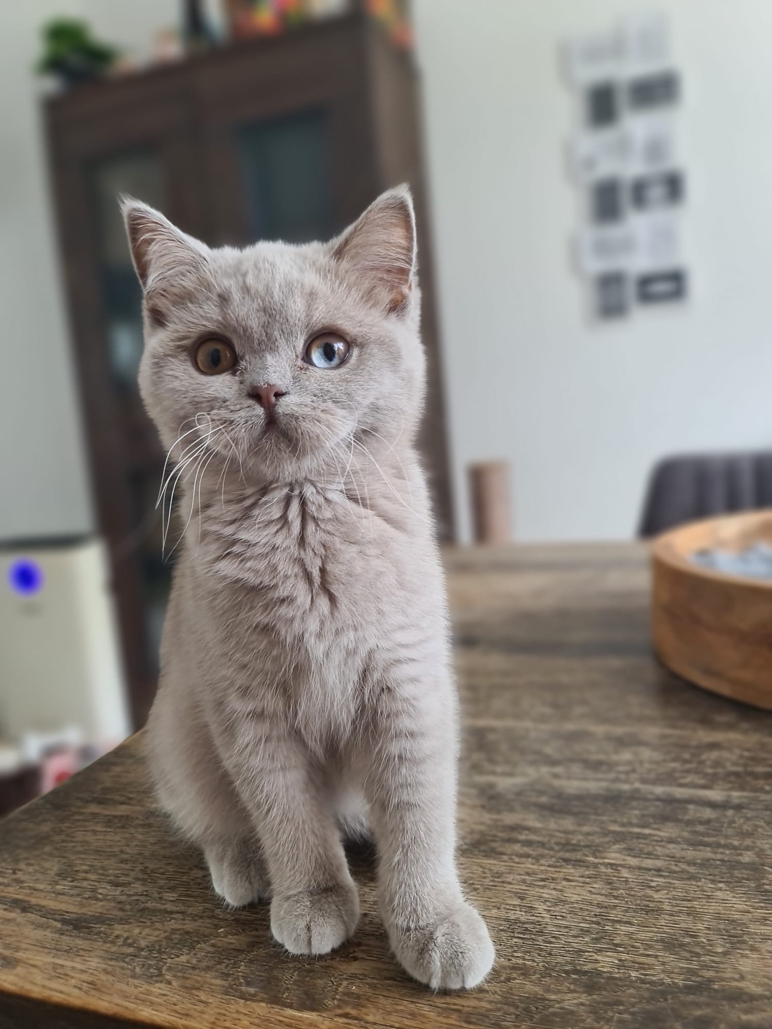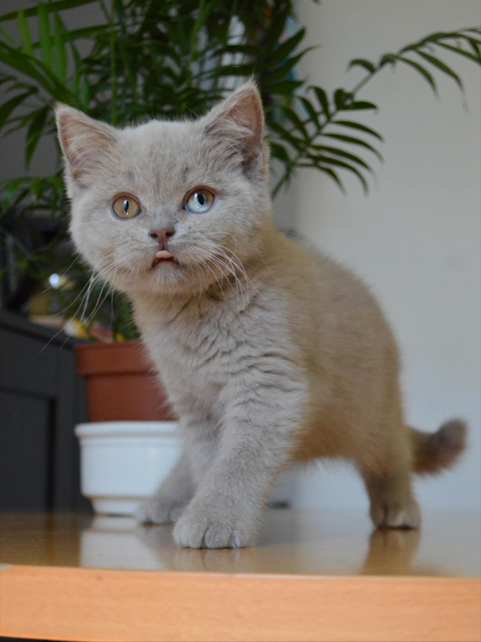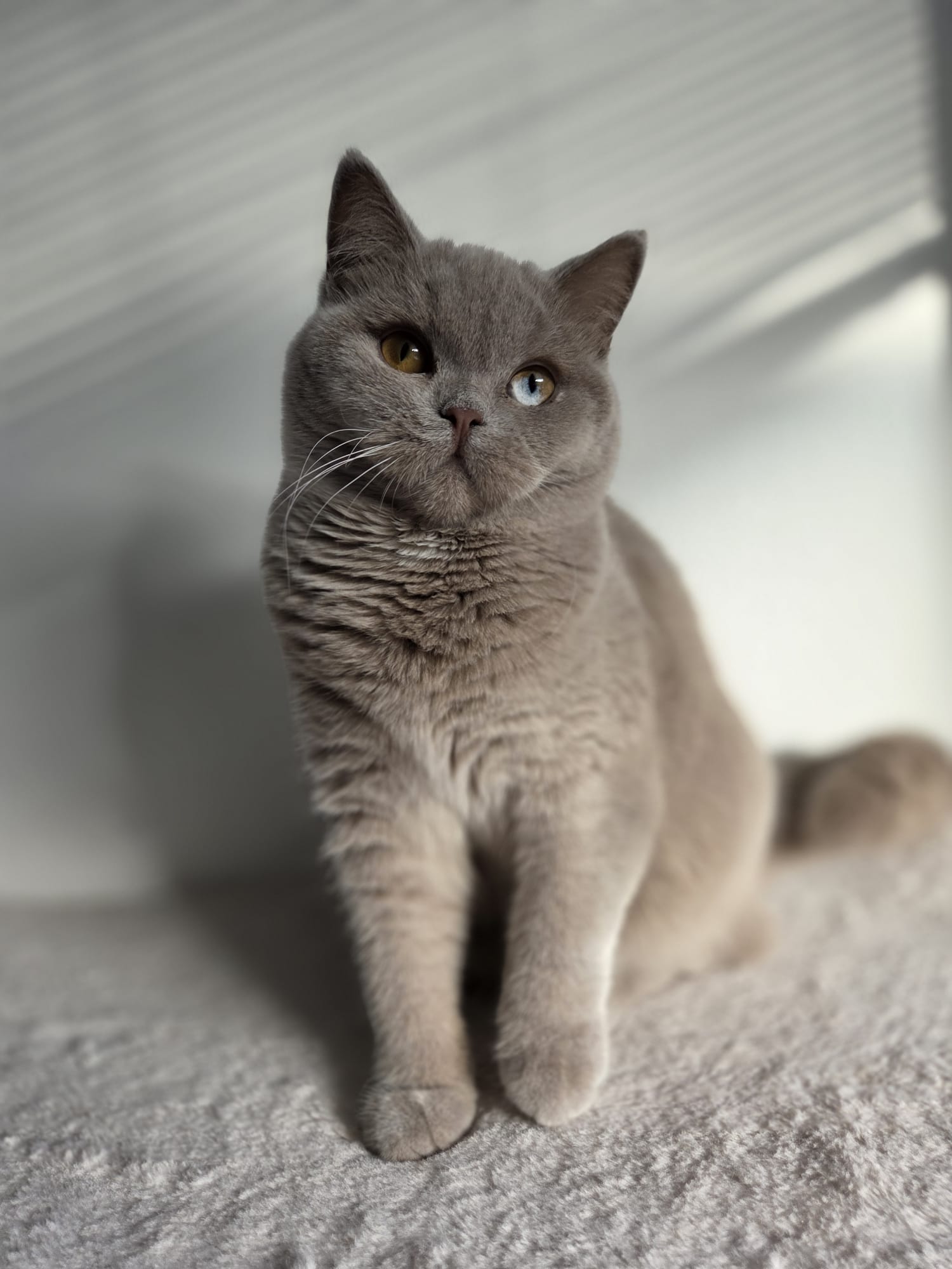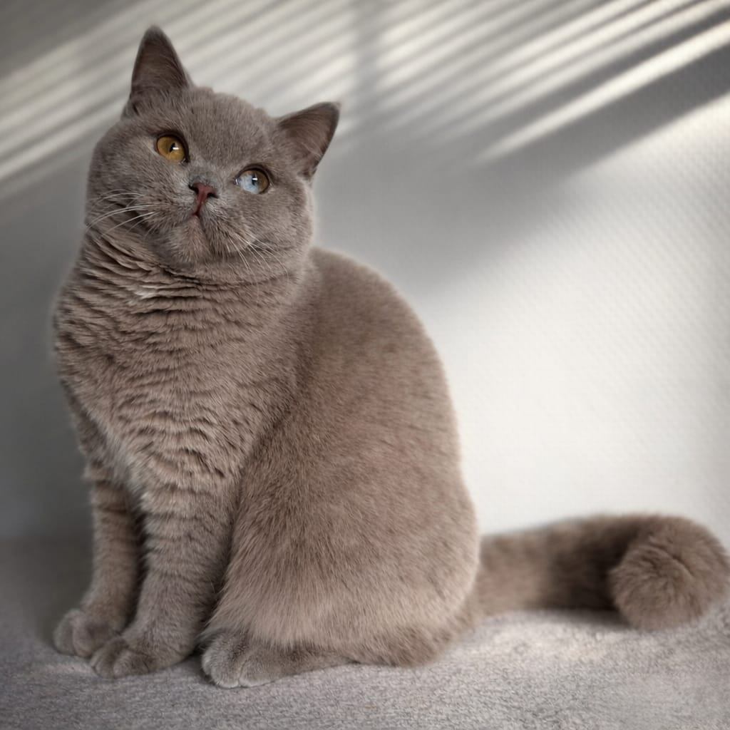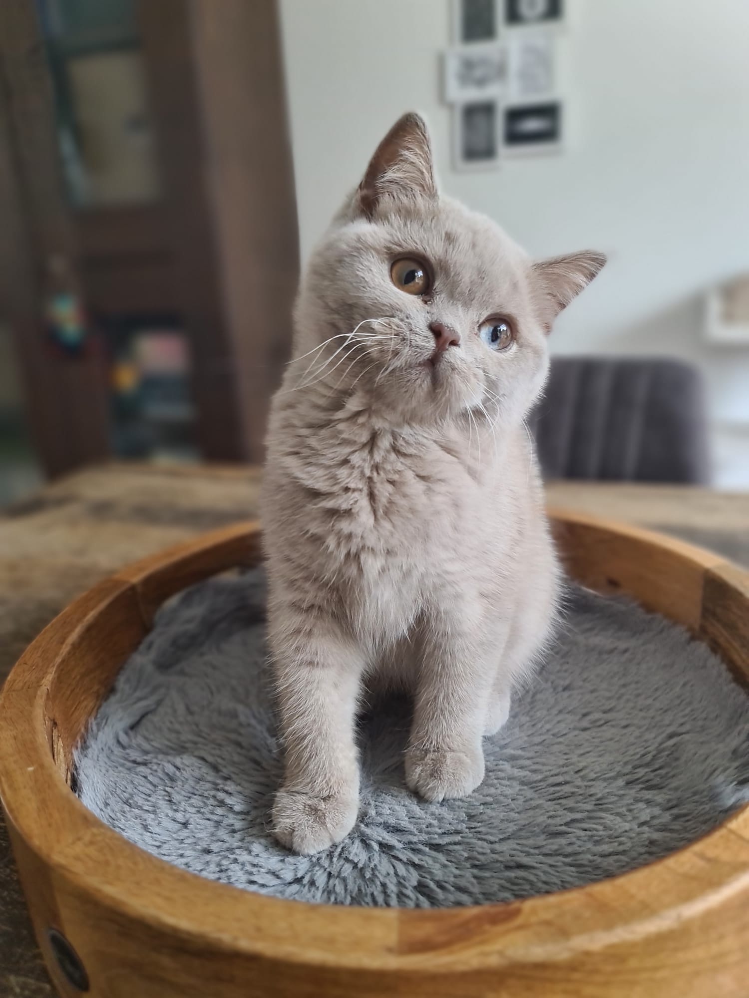 Fancy is een prachtige Britse Korthaar met een bijzondere uitstraling. Haar vacht heeft de kleur lilac, wat haar een zachte en verfijnde look geeft. Wat haar echter echt uniek maakt, zijn haar odd eyes: één oog is helder blauw en oranje en het andere oranje.