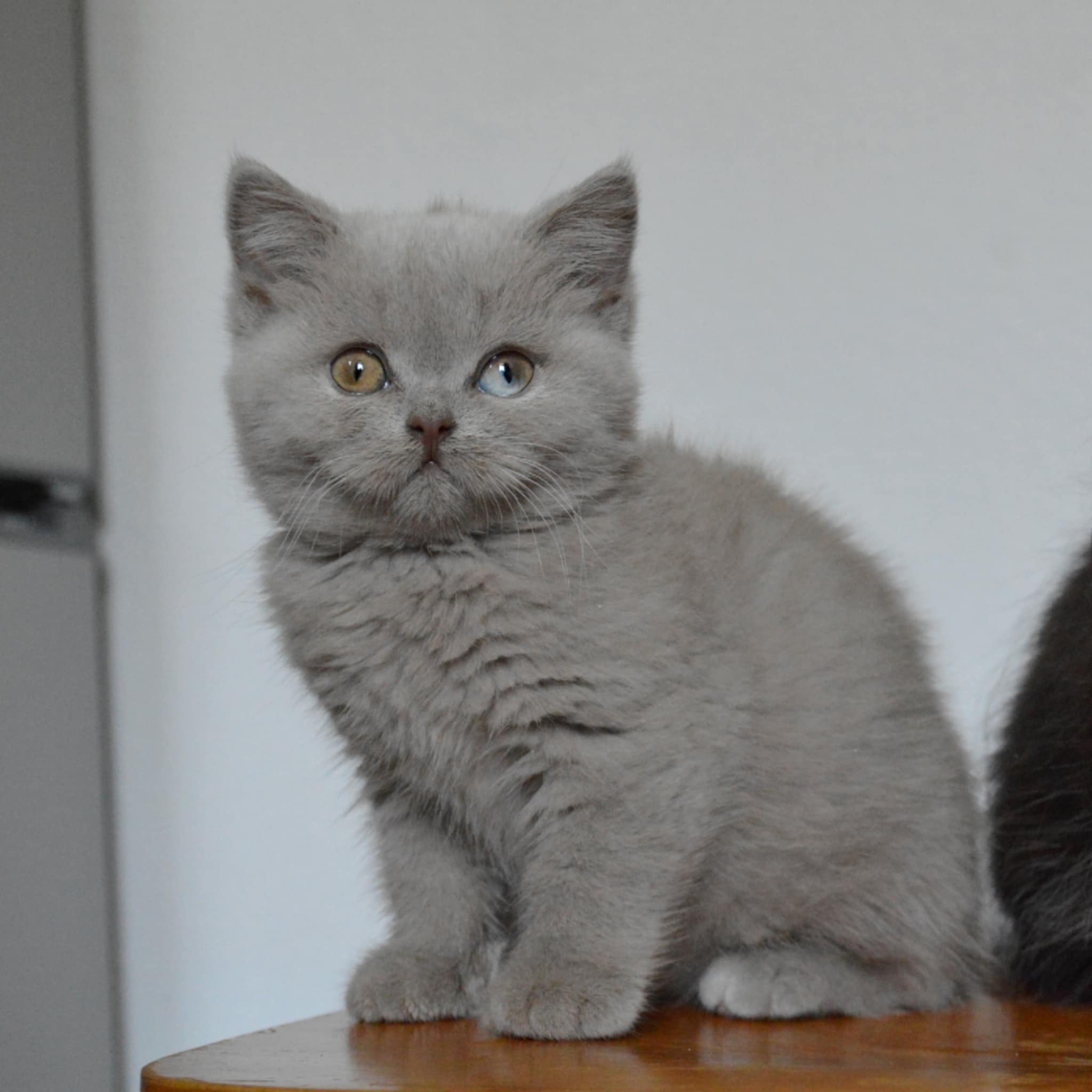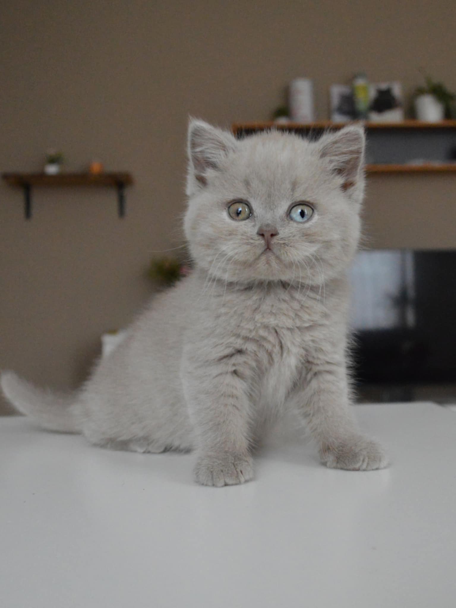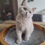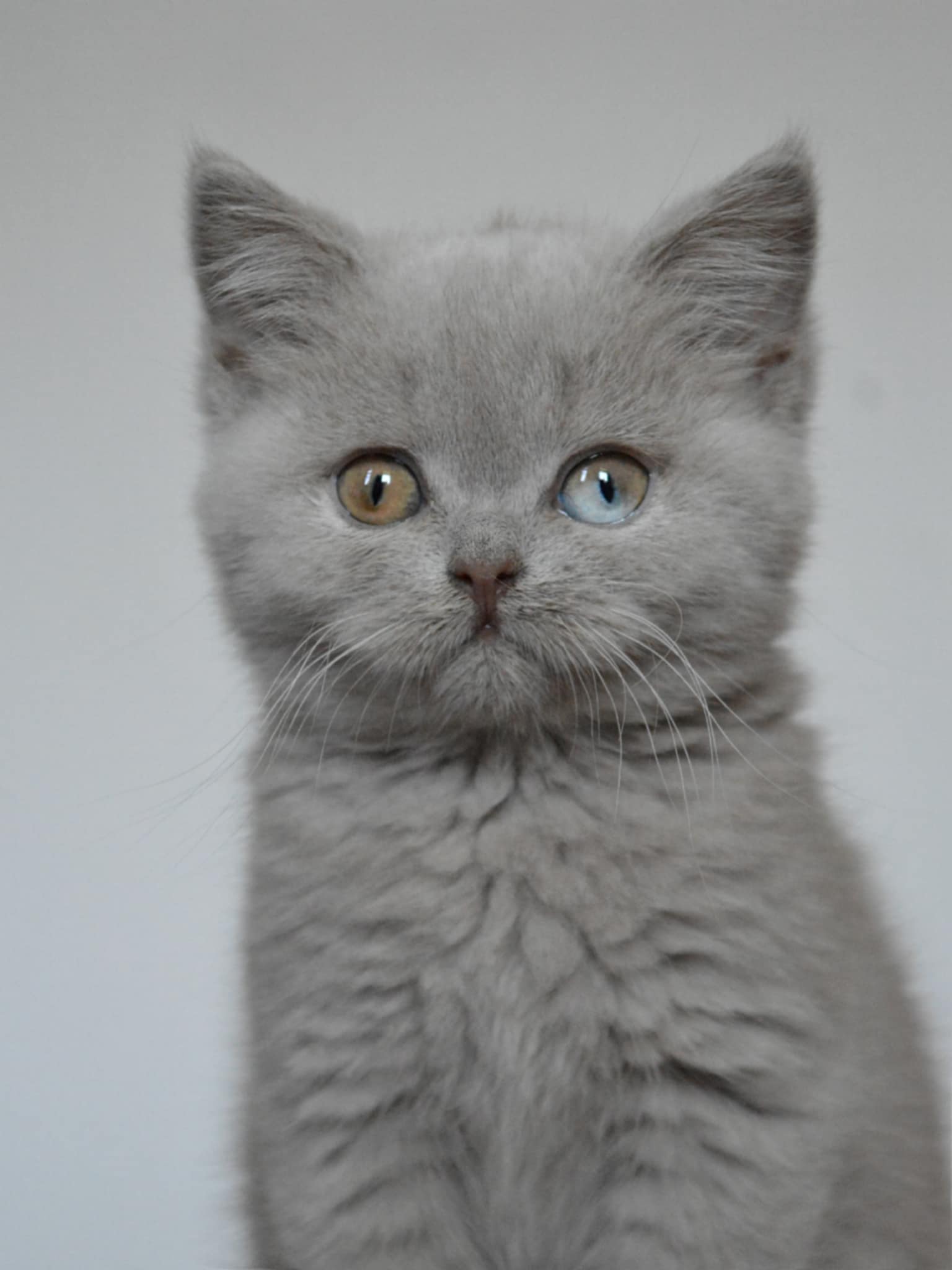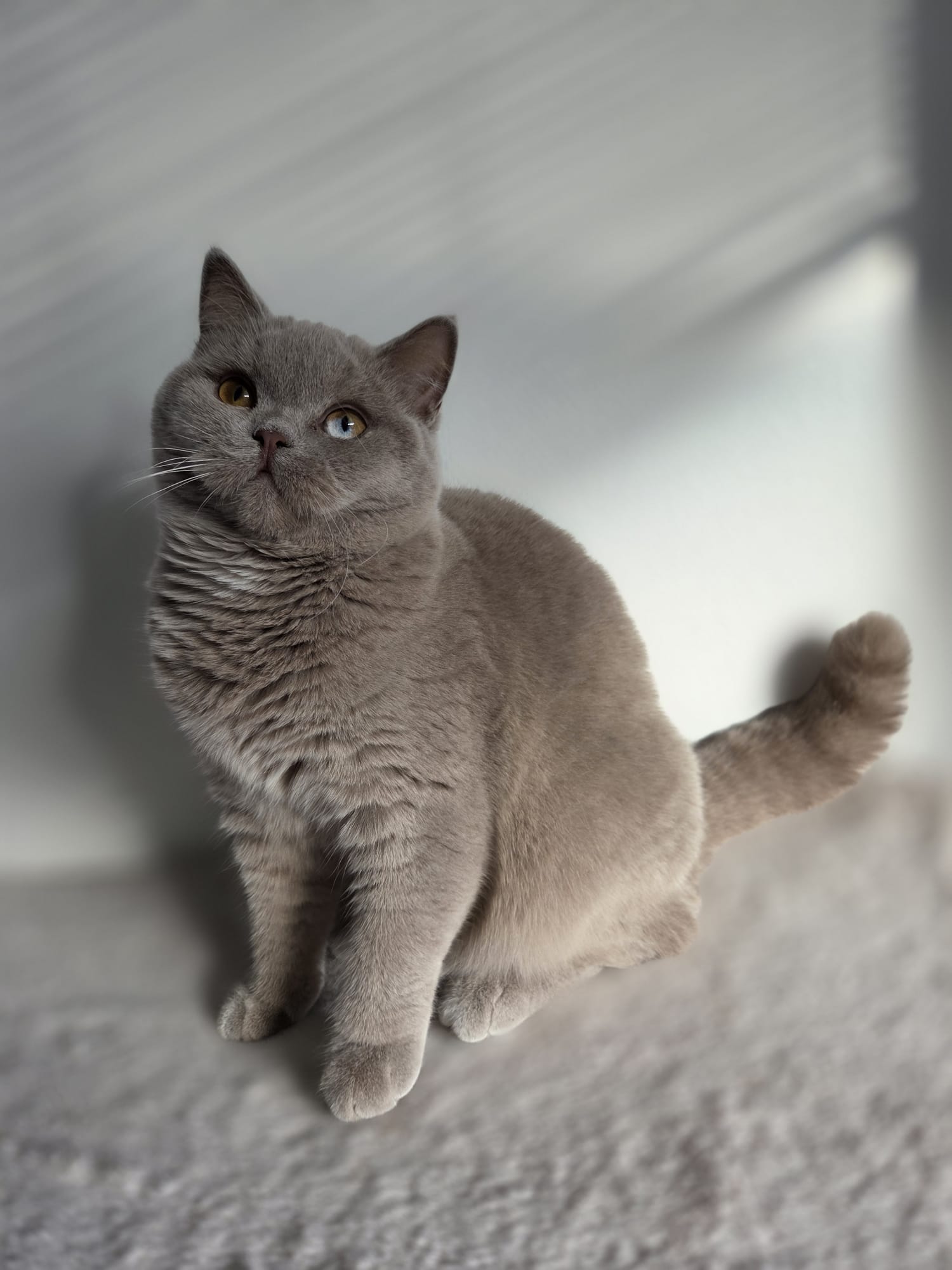 Fancy is een prachtige Britse Korthaar met een bijzondere uitstraling. Haar vacht heeft de kleur lilac, wat haar een zachte en verfijnde look geeft. Wat haar echter echt uniek maakt, zijn haar odd eyes: één oog is helder blauw en oranje en het andere oranje.