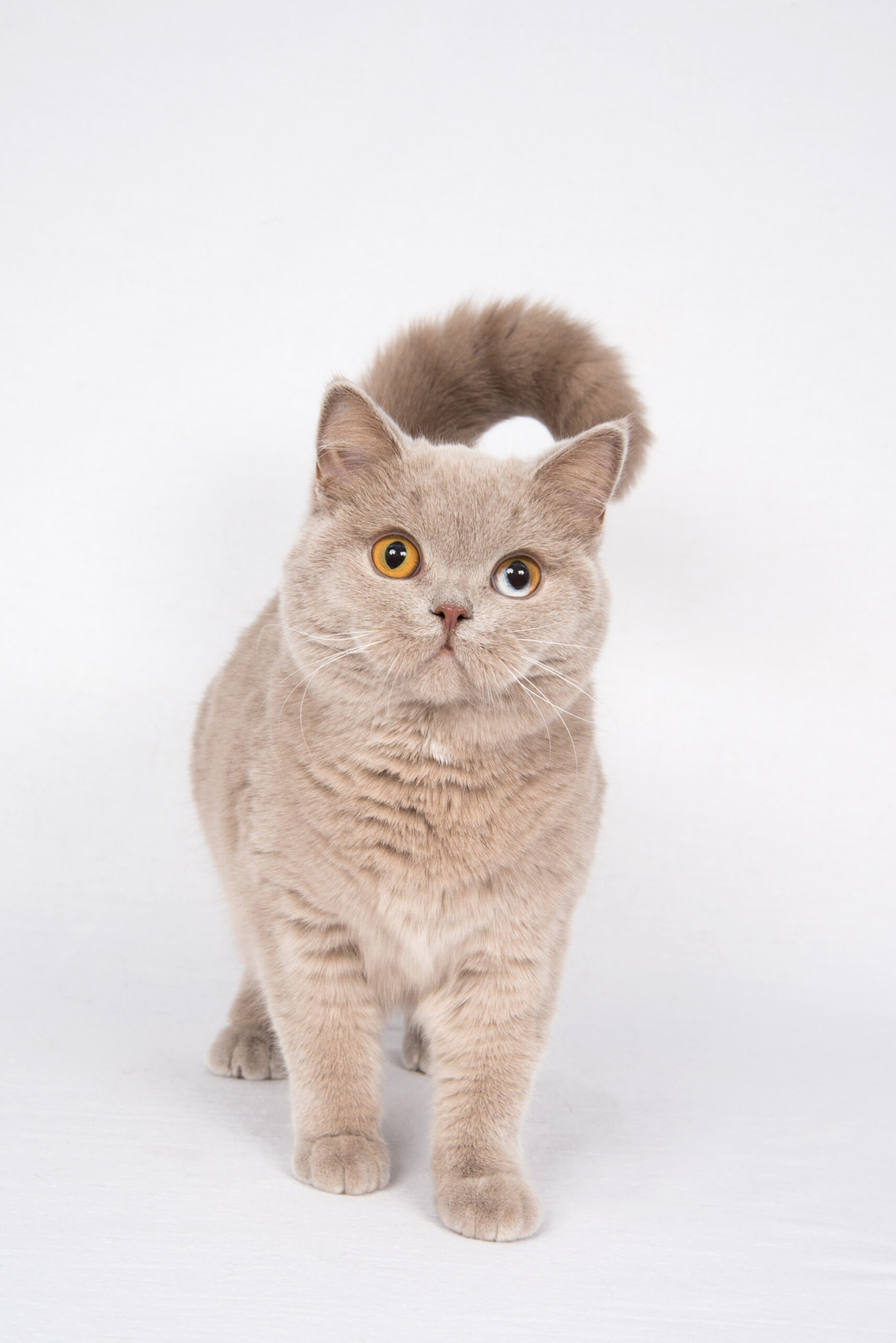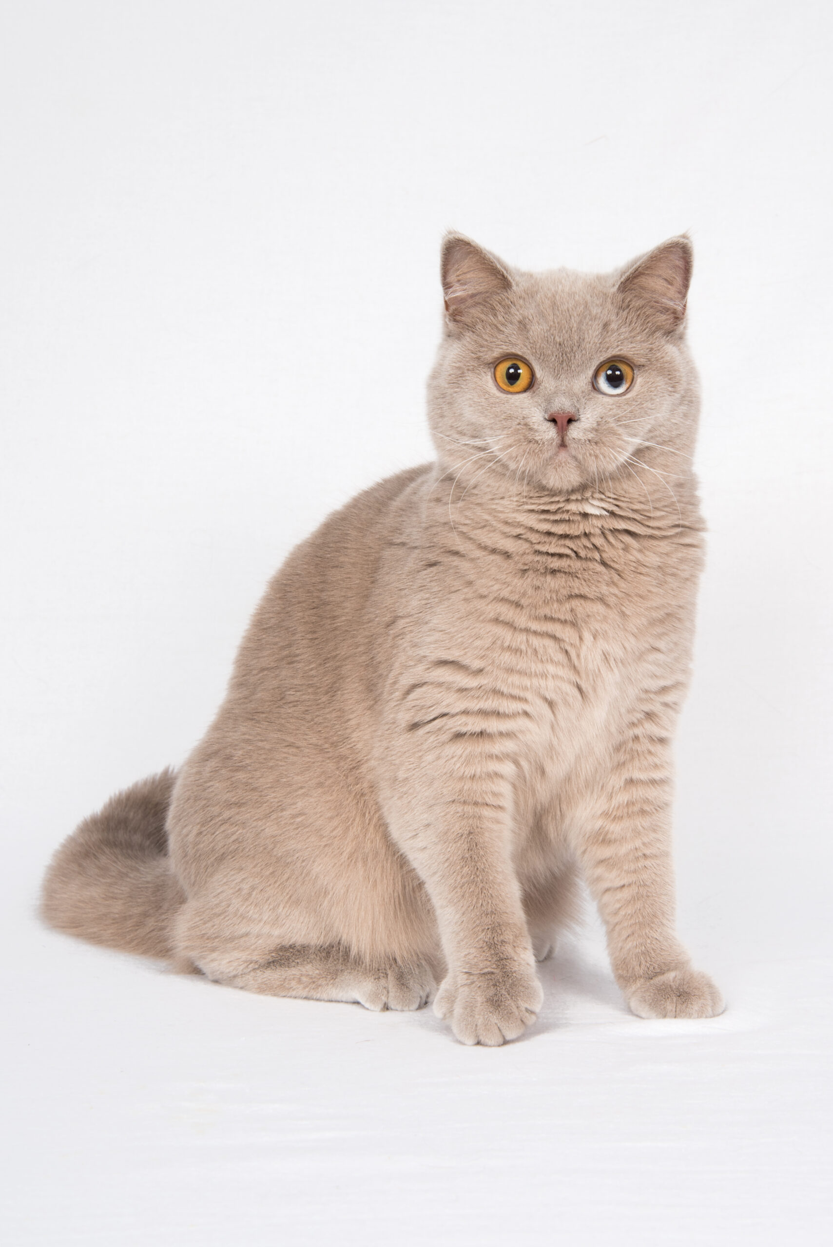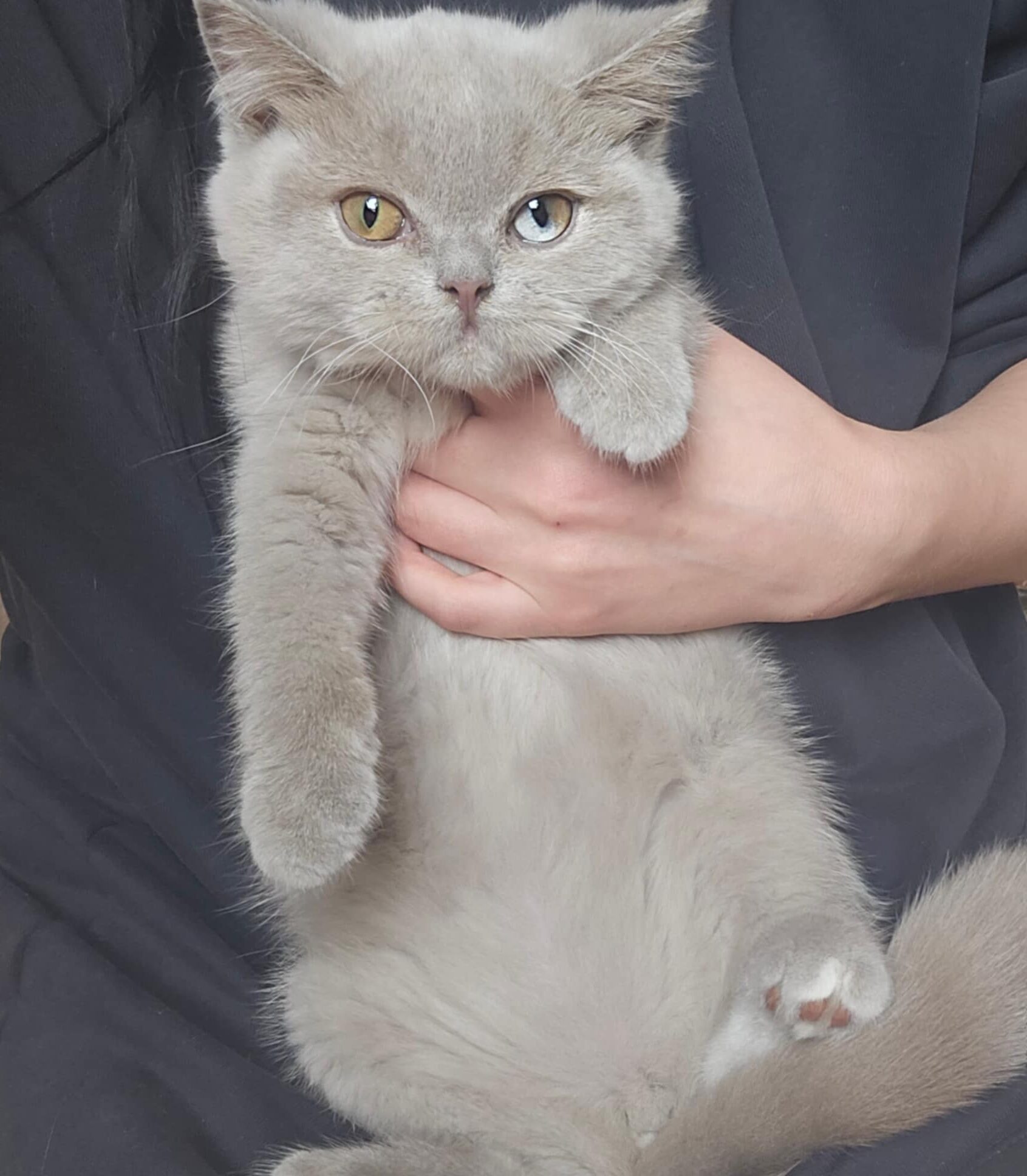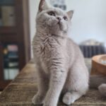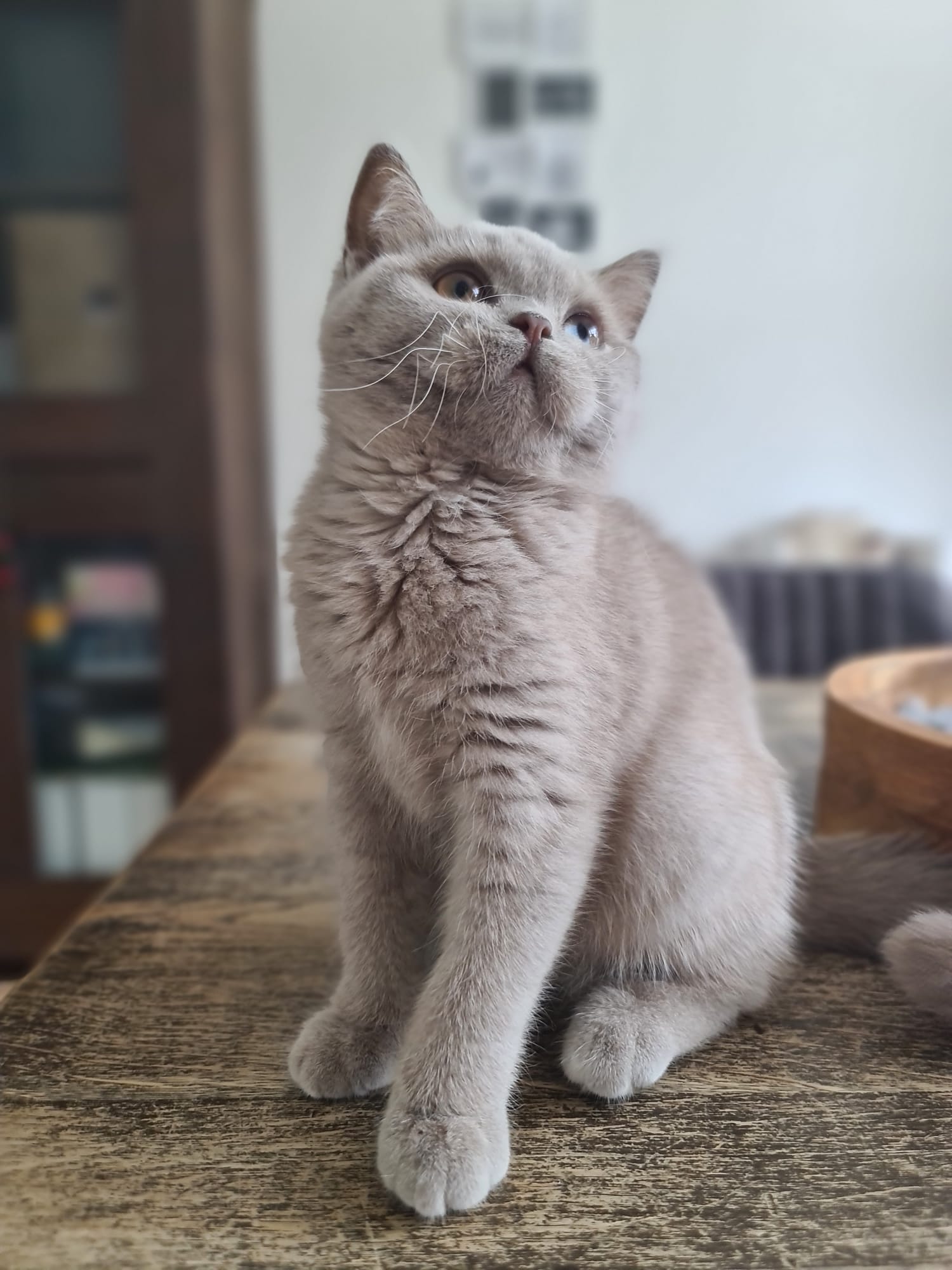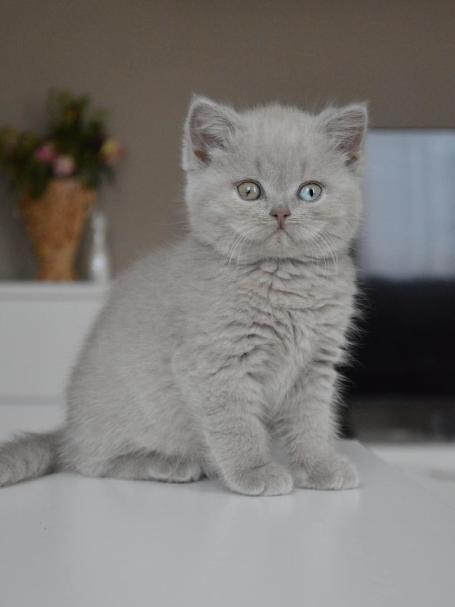 Fancy is een prachtige Britse Korthaar met een bijzondere uitstraling. Haar vacht heeft de kleur lilac, wat haar een zachte en verfijnde look geeft. Wat haar echter echt uniek maakt, zijn haar odd eyes: één oog is helder blauw en oranje en het andere oranje.